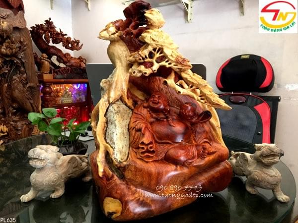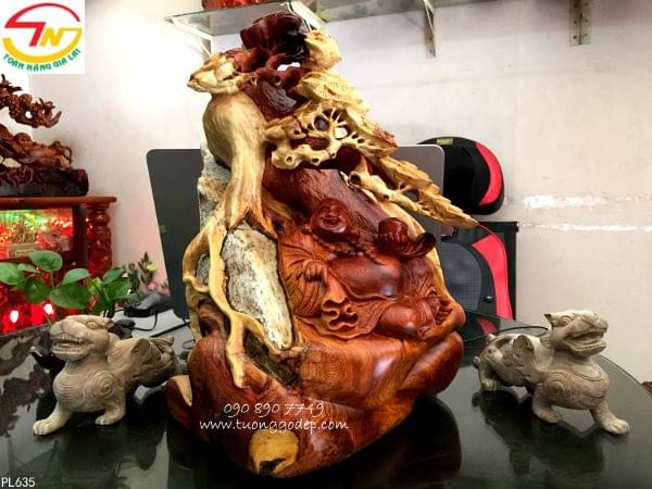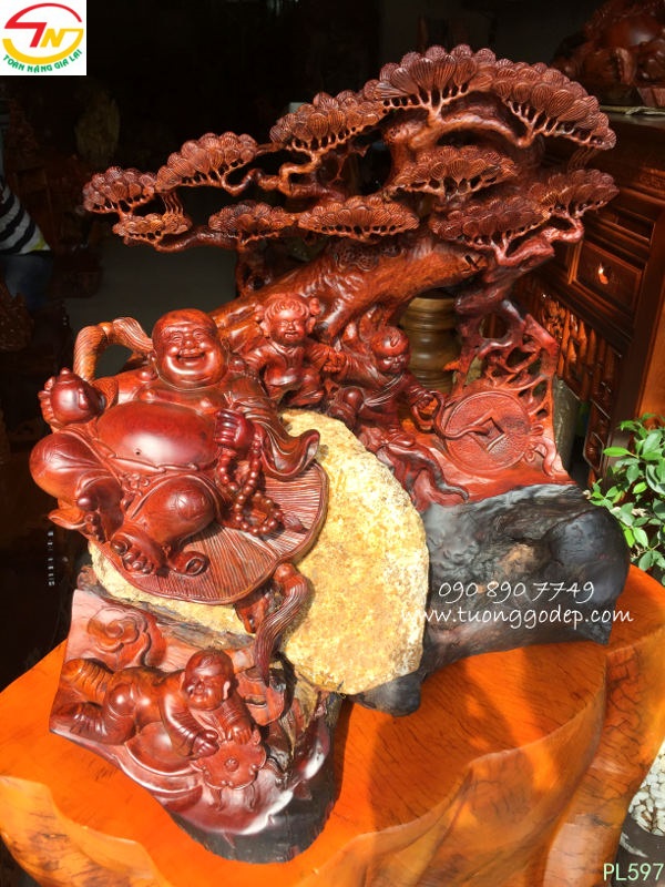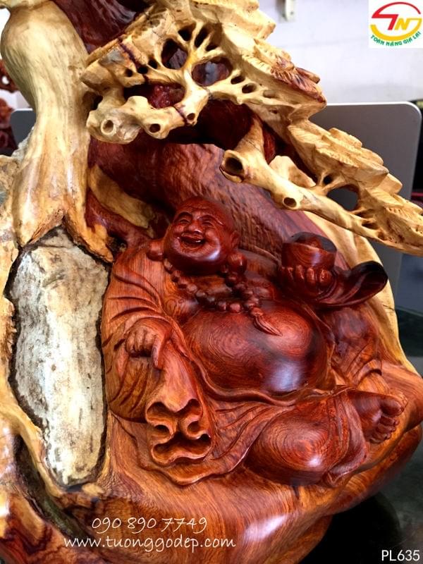 Phật Di Lặc ngồi cây tùng mang đến sự cát tường, vạn sự như ý cho gia chủ.. Phật Di Lặc tay cầm bát vàng mang ý nghĩa tài lộc.... Gỗ ôm đá mang ý nghĩa trường tồn...