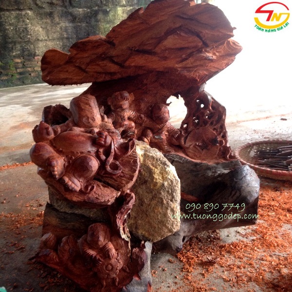 Ý nghĩa: Tượng Phật Di Lặc tay cầm bát vàng và ngồi gốc tùng mang ý nghĩa tài lộc và cát tường. Gỗ ôm đá mang ý nghĩa trường tồn...